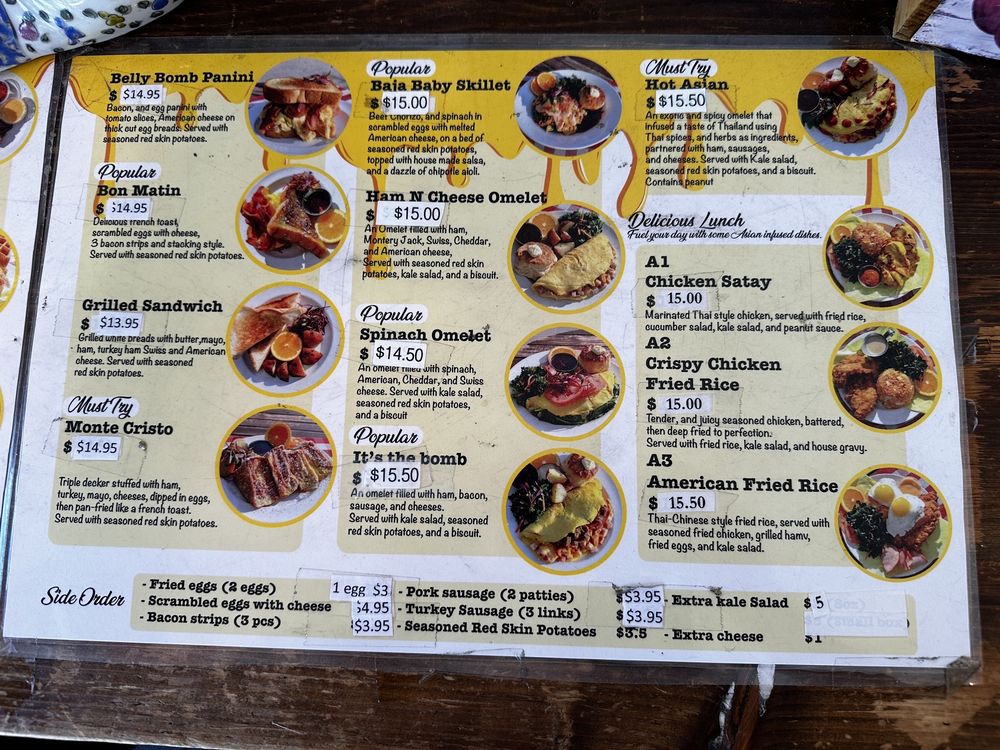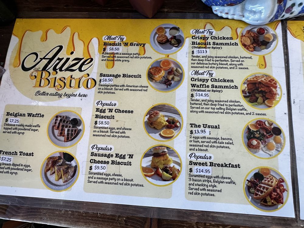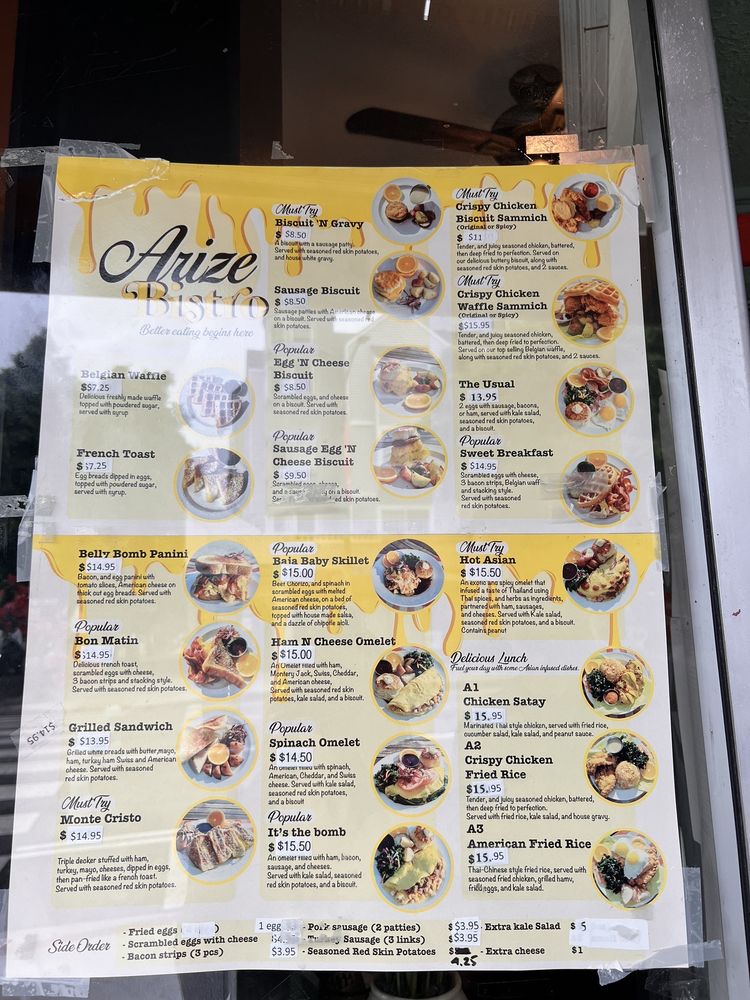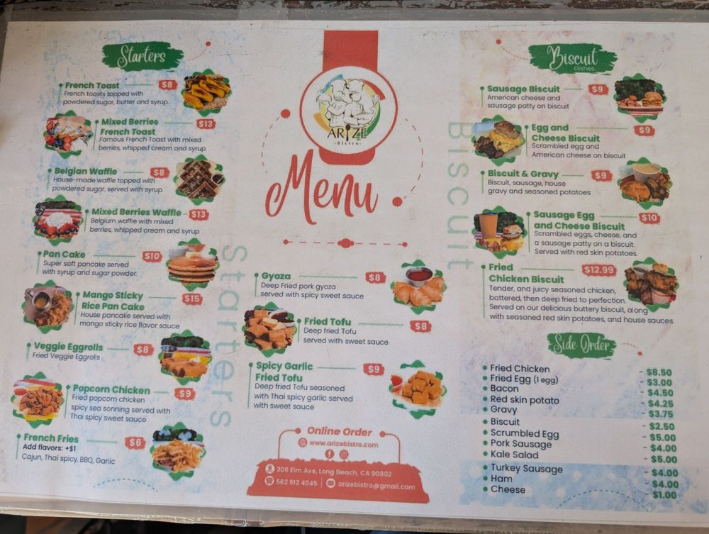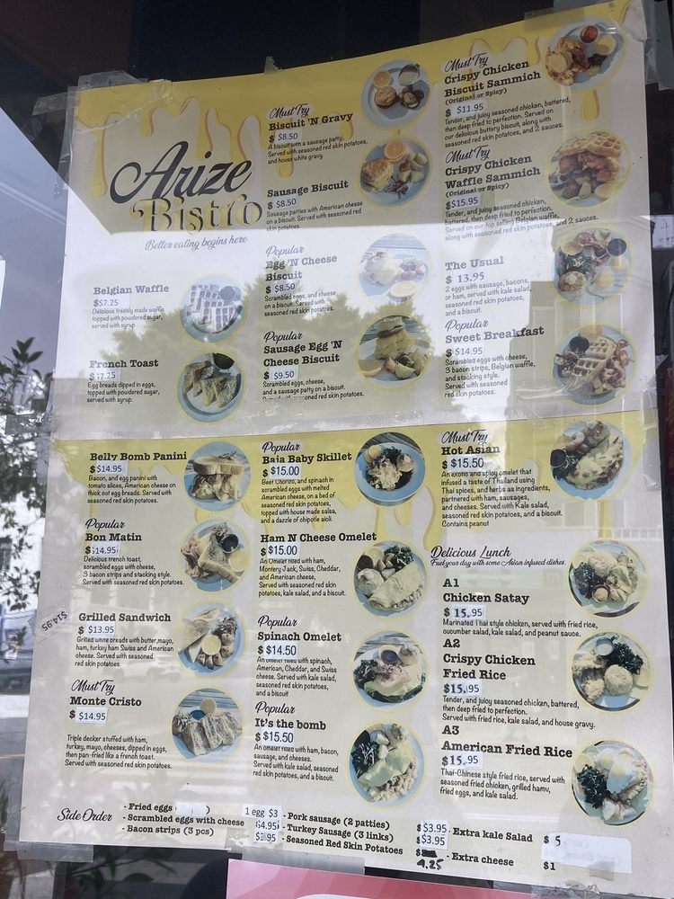 Arize Bistro in Long Beach, CA, offers a unique Asian Fusion experience with a focus on breakfast and brunch. The menu features a variety of options, including vegan and vegetarian choices. Customers rave about the Cold Brew coffee and Bomb omelette, highlighting the flavorful coffee and fluffy omelette filled with bacon, sausage, and cheese. The cozy and trendy ambiance, along with friendly service, makes dining at Arize Bistro a memorable experience. With options for outdoor seating, catering, and even a drive-thru, this spot caters to a diverse range of preferences. Whether you're in the mood for Thai-inspired dishes like the hot Asian omelette or classics like the crispy chicken waffle sammich, Arize Bistro has something for everyone. Don't miss out on trying their specialties like the sticky rice mango pancakes or the ice Thai tea with matcha cold foam. It's a foodie's paradise waiting to be explored.